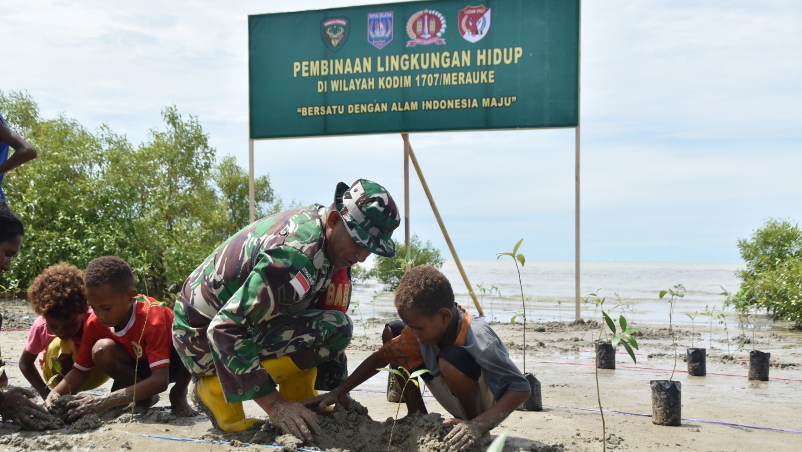 Mata Rajawali — Kodim 1707/Merauke terus menunjukkan kepeduliannya terhadap pelestarian lingkungan hidup melalui kegiatan sosialisasi pencemaran lingkungan dan penanaman mangrove bersama masyarakat Kampung Payum, Kelurahan Samkai, Distrik Merauke, Kabupaten Merauke, Provinsi Papua Selatan, Jumat (19/12/2025).