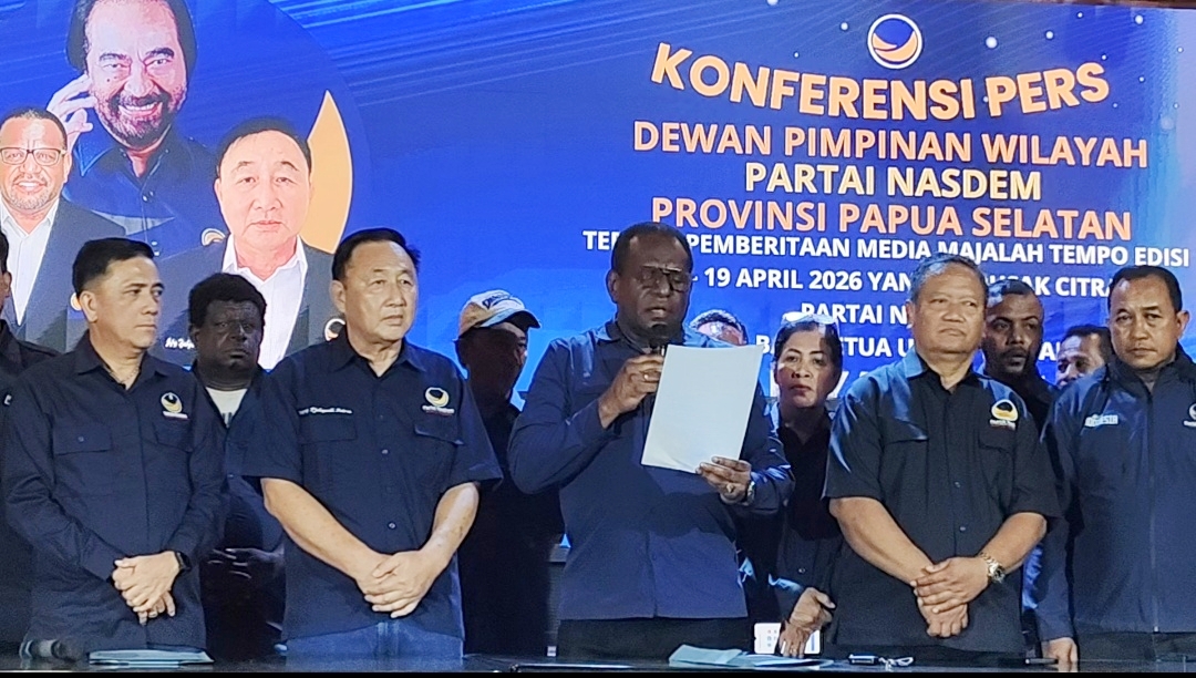 Merauke, Mata Rajawali.Com – Ketua Dewan Pimpinan Wilayah (DPW) Partai Nasdem Propinsi Papua Selatan (PPS) yang juga Bupati Kabupaten Merauke, Yoseph Bladib Gebze didampingi Sekretaris DPW Nasdem PPS, Jefry Tjahyadi dan seluruh kader mendesak majalah tempo memohon maaf secara terbuka. Desakan itu berkaitan dengan isi pemberitaan Majalah Tempo edisi 13-19 April 2026.